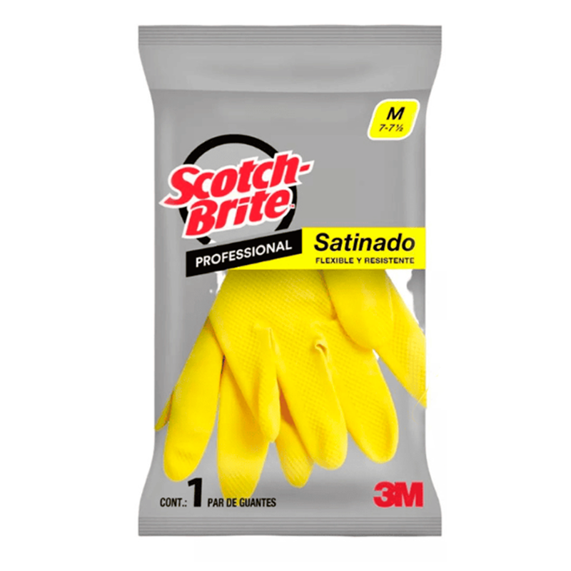 Guantes de látex satinado amarillo 3M en talla mediana, diseñados para tareas de limpieza y uso doméstico. Ofrecen protección contra químicos ligeros, comodidad en el ajuste y resistencia a la abrasión.