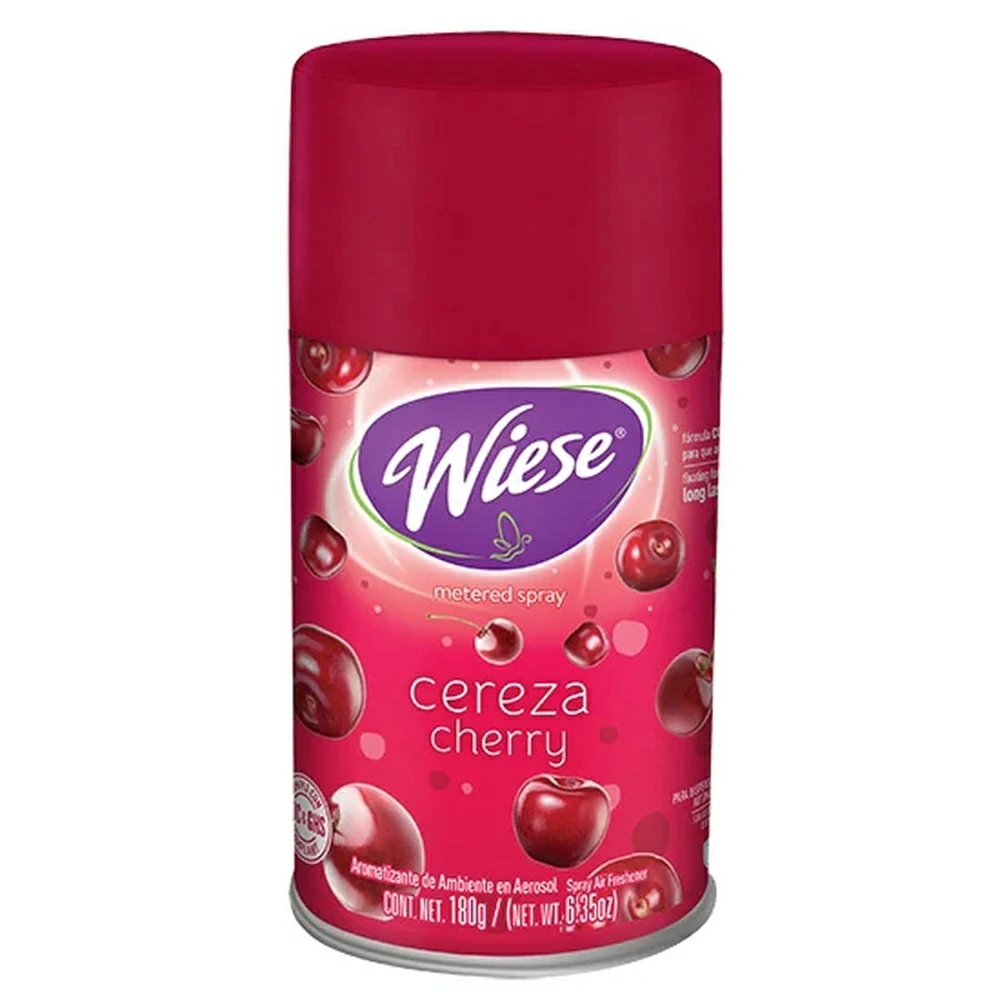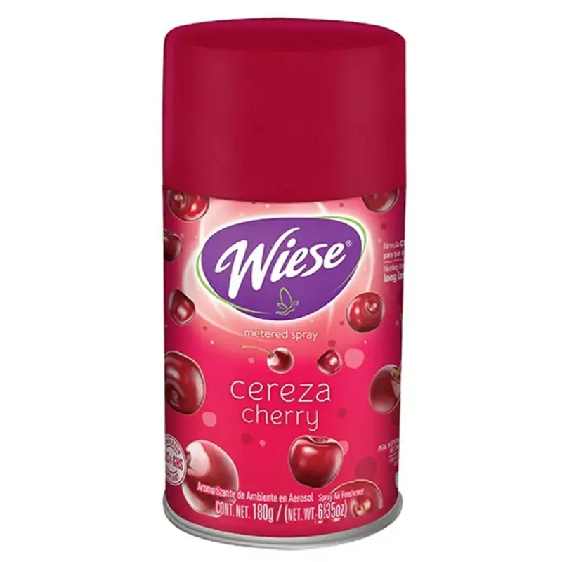 Repuesto de aerosol Wiese aroma Cereza 180 g para dispensador automático. Neutraliza olores y deja un dulce aroma a cereza en ambientes cerrados como baños, oficinas o salas de espera.