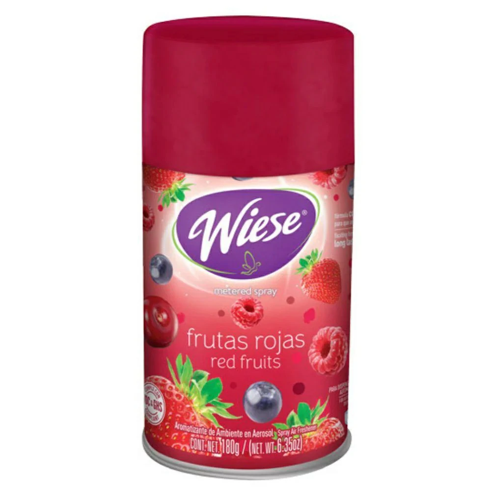 Aerosol Wiese Frutas Rojas 180 g para dispensador automático. Proporciona una fragancia intensa y fresca de frutos rojos, perfecta para ambientes domésticos y comerciales.