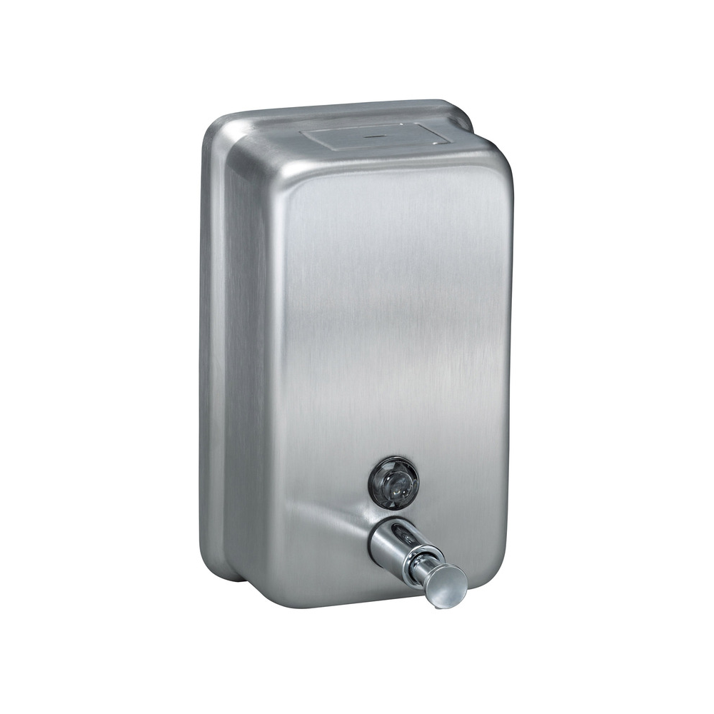 El dispensador de jabón montado en superficie se debe fabricar de acero inoxidable calibre 20 con acabado satinado. El dispensador debe contar con un montaje completamente oculto, cubierta con orificios de relleno resistentes al vandalismo e indicador de mirilla. Válvula de presión para jabón líquido resistente a la corrosión. Capacidad: 1183 ml (40 oz.) de jabón líquido. Opera con menos de 2,3 kg. (5 lbs.) de fuerza.