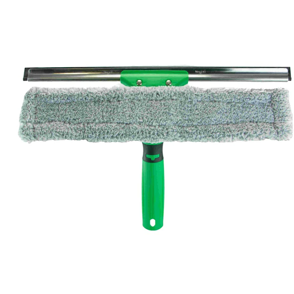 Una arandela de tiras y una escobilla en uno. Simplemente lavar, dar la vuelta y limpiacristales con la mano o el poste. El resorte de liberación rápida acepta canales Pro y “S” (no incluidos). Los cabezales se pueden compensar para limpiar sobre repisas. Esta herramienta funciona fácilmente con cualquier polo.