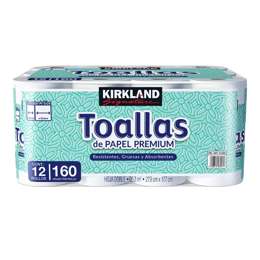 Kirkland Signature toallas desechables son más fuertes y absorbentes. Este paquete premium viene en presentación de 12 rollos grandes.
