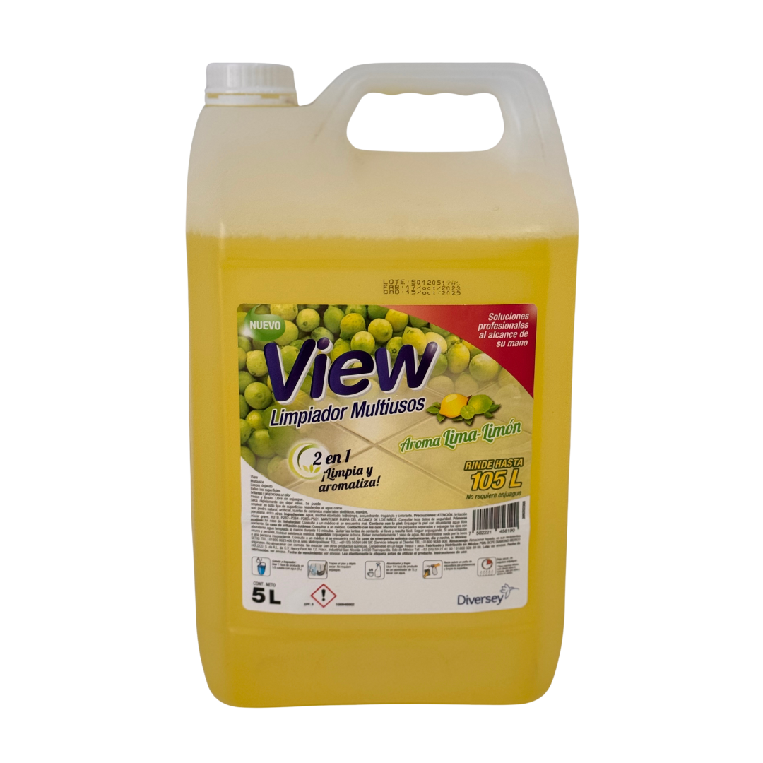 Limpiador multiusos view, deja superficies brillantes y proporciona olor fresco. Se seca rápidamente sin dejar velos y se emplea en superficies resistentes al agua.