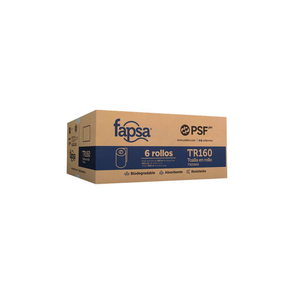 Papel hoja sencilla, rollo de 160 metros. Presentación en caja con 6 piezas.